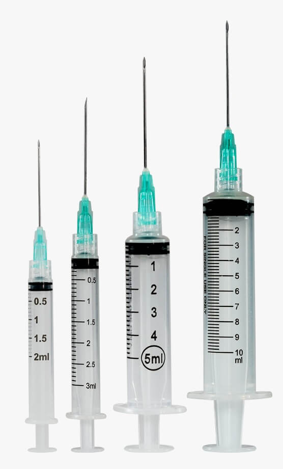 3ml syringe with needle that comes in a quantity of 25, 50 or 100.